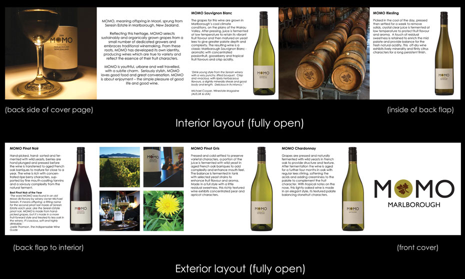 This project involved all the photography (except the stock bottle shots) and layout for a 5-fold brochure produced for NZ-based MOMO Wines in 2009.